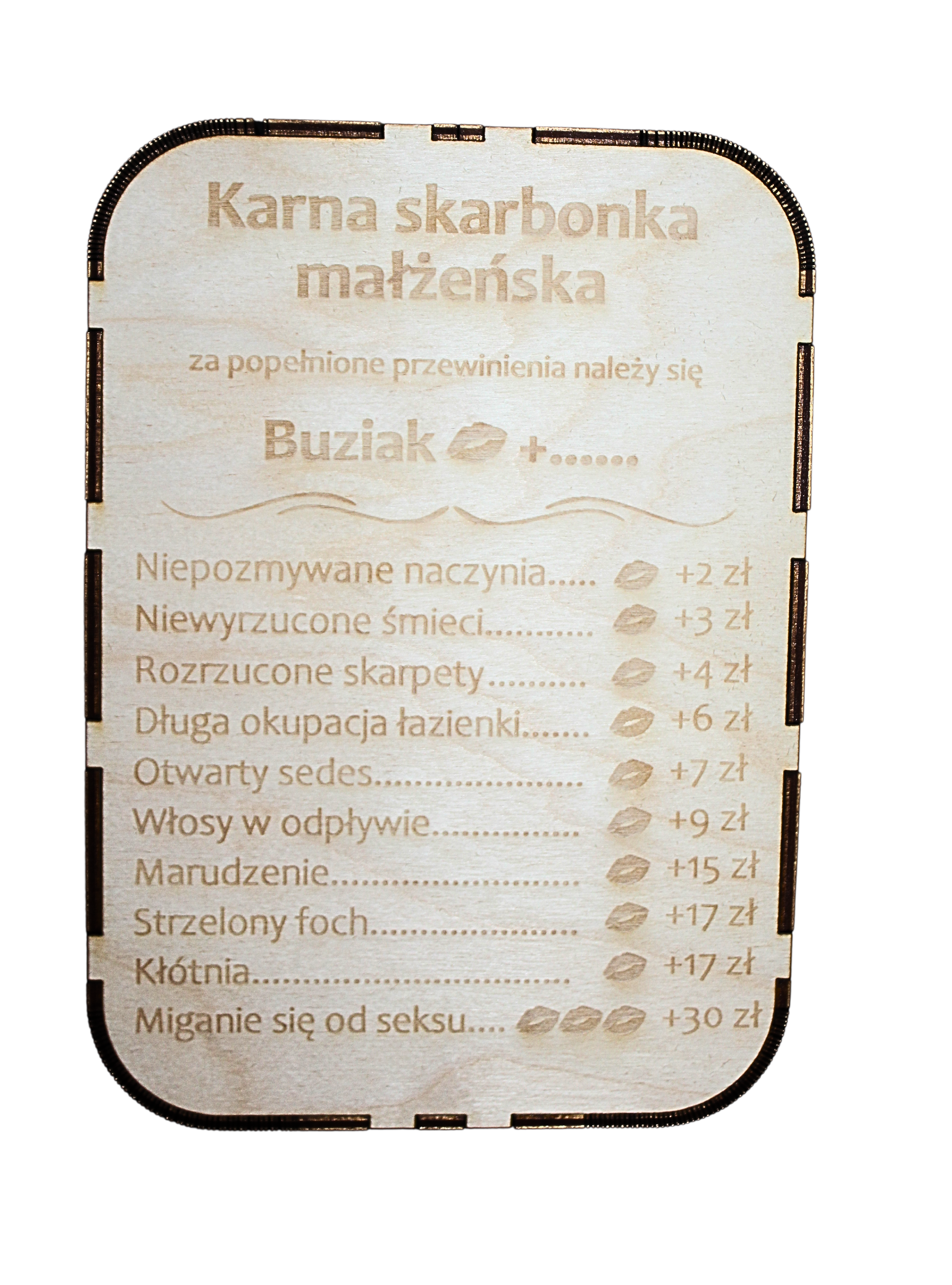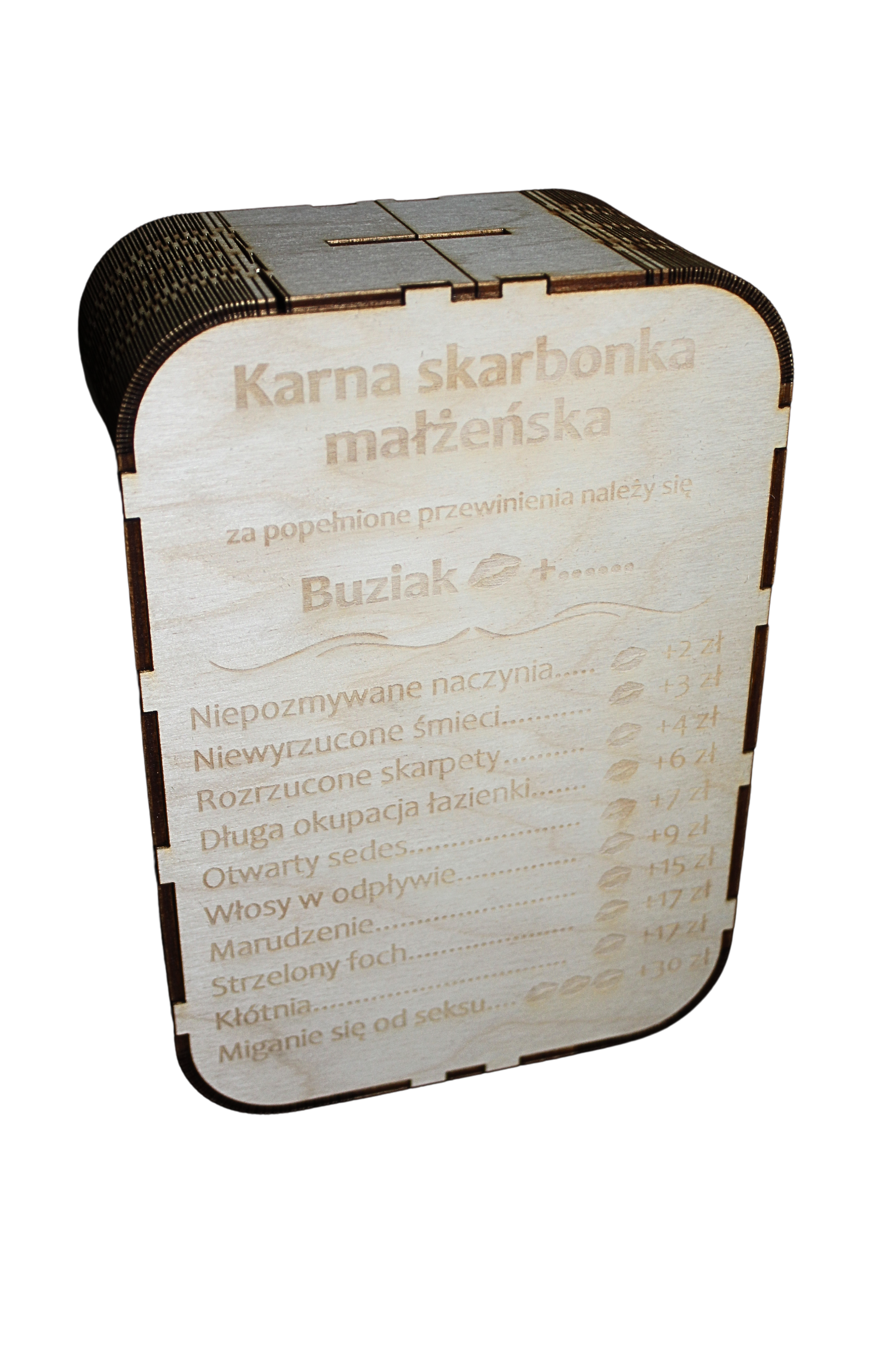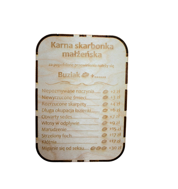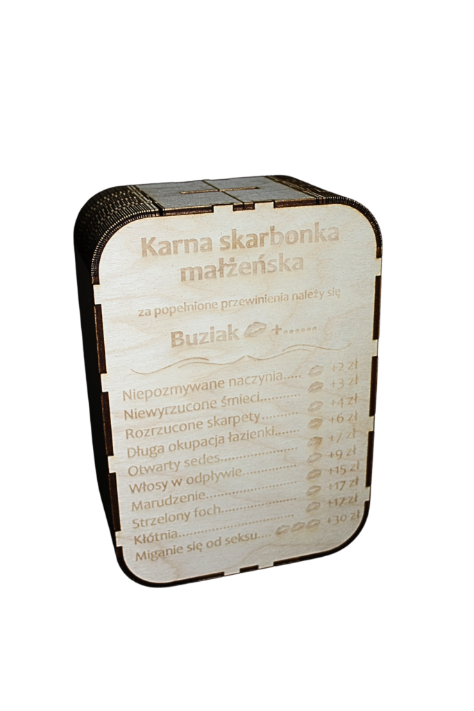 Skarbonka karna małżeńska z drewna jest zabawnym gadżetem, który dodatkowo motywuje do oszczędzenia – idealnie sprawdzi się jako prezent z okazji rocznicy ślubu lub nawet z okazji samego ślubu. Każde pudełko jest wykonywane na zamówienie – specjalnie dla Ciebie!
